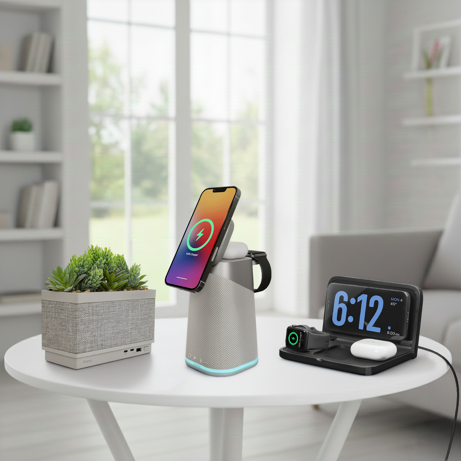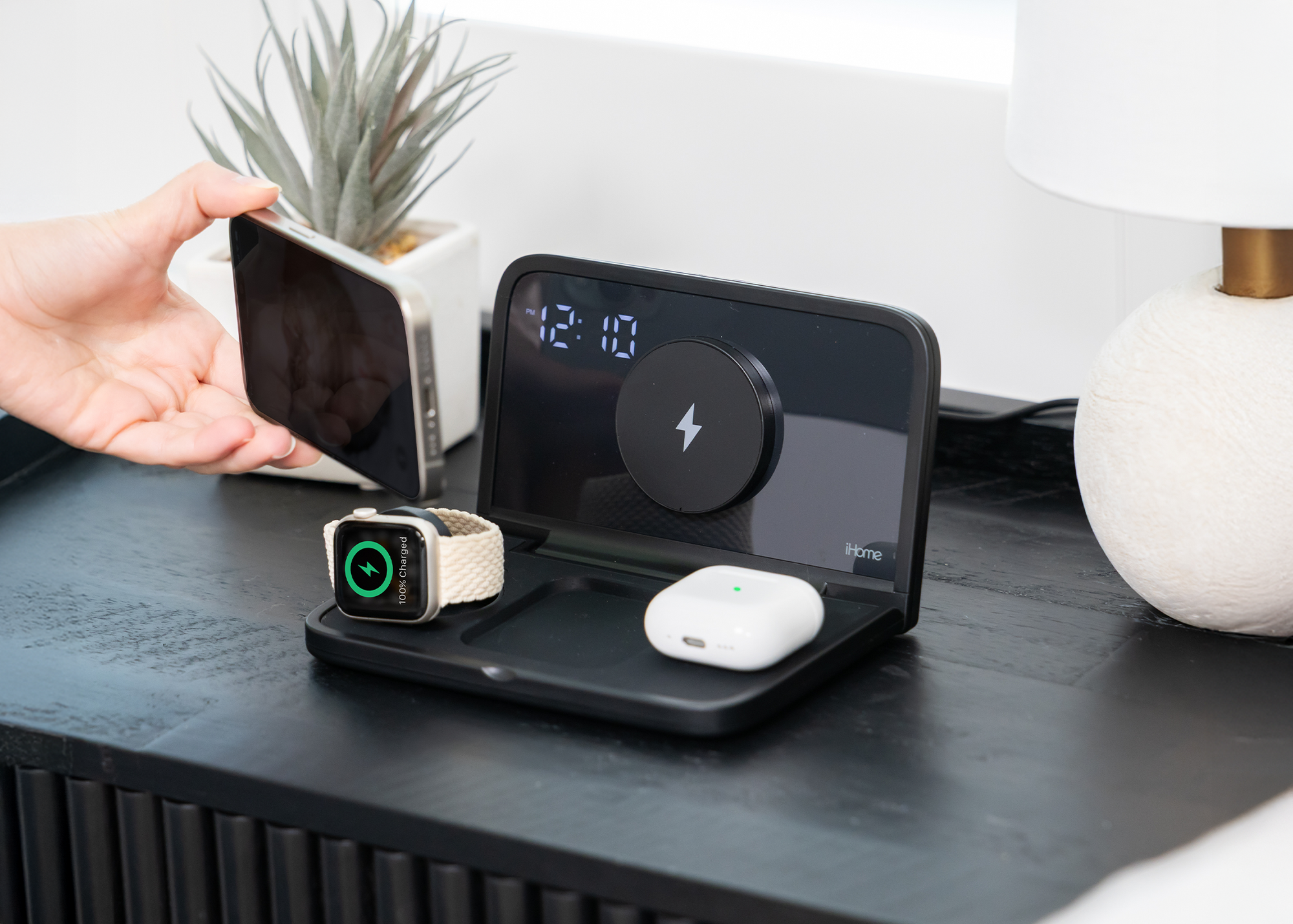 Stay organized, fully charged, and on schedule—no matter where life takes you. The iHome iWW7 Triple Charging Clock combines a compact digital clock with three wireless charging pads, making it the ultimate travel-friendly power hub for your essential Apple devices. Its sleek, foldable design packs easily into any bag, so you can bring reliable charging and stress-free wake-ups to hotels, offices, dorm rooms, or your bedside at home.